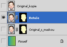 Dalším krokem je retuše obličejové části. K tomuto použijeme nástroje Záplata, Bodový retušovací štětec a Retušovací štětec. Vytvoříme si kopii vrstvy (té s maskou) a začneme s retušováním.