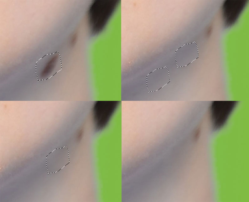 Začneme menšími nedostatky jako znaménka, jizvy a pupínky a budeme pokračovat vráskami kolem rtů a na krku. Nástroj Záplata lze použít tak, že obtáhneme dané místo a pak přesuneme výběr do oblasti s podobným odstínem a vzorkem. Nástroj automaticky vyhladí chyby ve zdrojové oblasti.