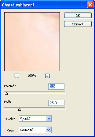Obličej si přesuneme mírně doprava a aplikujeme filtr Chytré vyhlazení (z menu Filtry>Rozostření). V následujícím okně nastavíme tyto parametry: