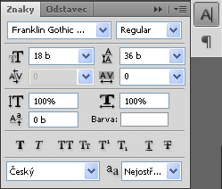 Barvy byly využity pouze 2 - bílá a žlutá. Žluté části vrhají lehký stín, zbytek je bílý. Vlastnosti textu lze upravit v panelech Znaky a Odstavec.