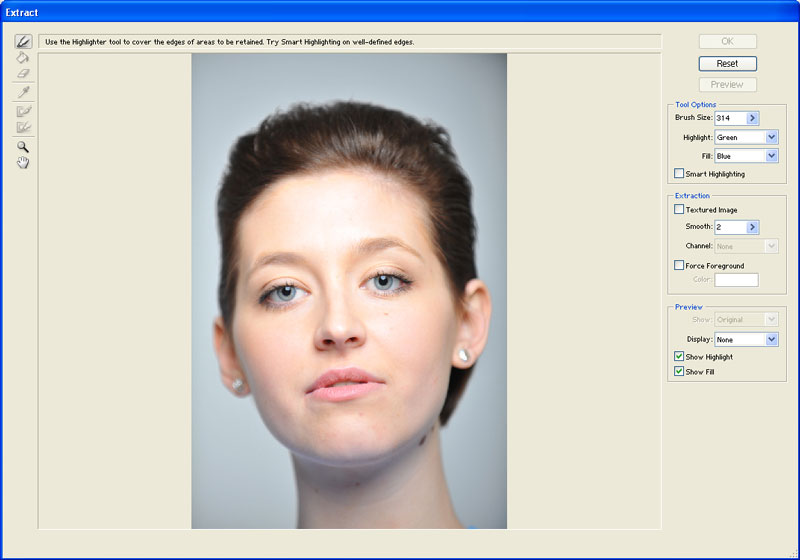 Pokud musíme vybírat oblasti s neostrými hranami jako například objekty v pohybu nebo konce vlasů, může se nám hodit filtr Extract (Oddělit), který je zdarma k dispozici na Internetu pro Photoshop. Duplikujeme si tedy vrstvu a filtr aplikujeme z menu Filtry>Extract...