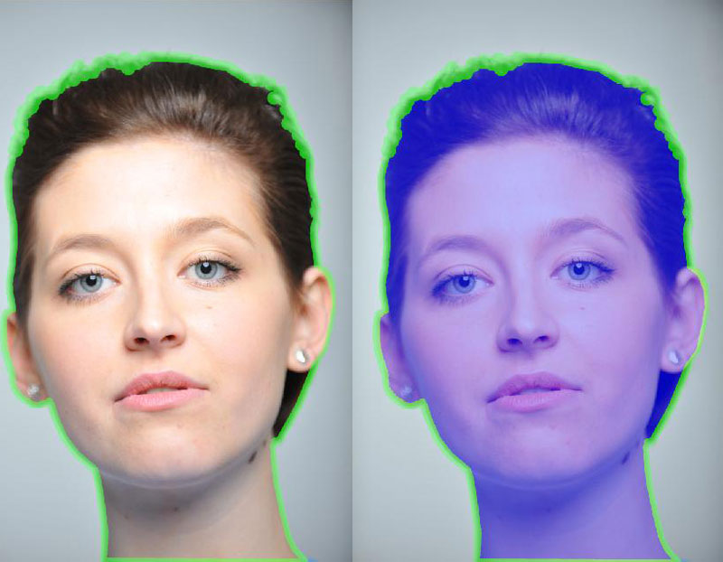 Můžete se nyní podívat na náhled (Preview) a vidíte, že byly vymazány všechny plochy, kde na horní hraně nebyla žádná barva a ponechány pouze ty plochy, které byly vyplněny modrou barvou. V místě zeleného označení byl vytvořen jemný přechod. Pokud si přiblížíte na obrázek a naleznete chyby, lze použít nástroj Vyčištění (Cleanup) nebo Úprava obrysů (Edge Touchup). Vyčištění se hodí na různé částečky prachu - krytí oblasti je snižováno, při stisku ALT zvyšováno.