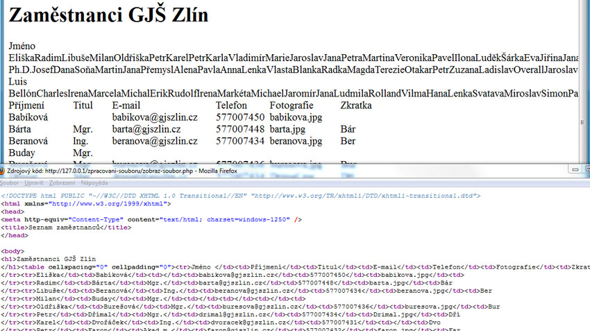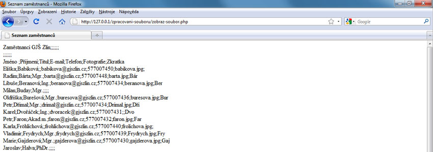 Podívejme se nyní na výsledný výpis dat ze souboru do prohlížeče. Uvědomme si, že bychom si přáli udělat pěknou html stránku, která bude obsahovat nadpis a v tabulce seznam zaměstnanců. Zatím máme v prohlížeči pouze "surová" data (viz obrázek).
