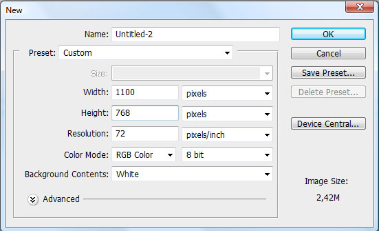 Navrhovaná webová stránka bude mít velikost 750 bodů na šířku. Vytvoříme ve Photoshopu nový soubor (Soubor -> Nový) o rozměrech 1100x768px. Vše nastavíme jako na následujícím obrázku (jméno dokumentu si nastavíme podle potřeby).