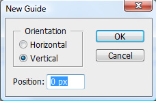 Nyní, obdobně jako v obrázku, vložíme vodítka na požadované pozice. První vodítko můžeme umístit tažením z horního pravítka na horní okraj dokumentu. Další horizontální vodítko umístíme přes menu zobrazit -> nové vodítko. V dialogu zvolíme orientaci vodítka a jeho pozici v pixelech. Takže například pro první vodítko pod bannerem vybereme horizontální orientaci vodítka a zadáme hodnotu 200px (banner tedy bude mít výšku 200px).
